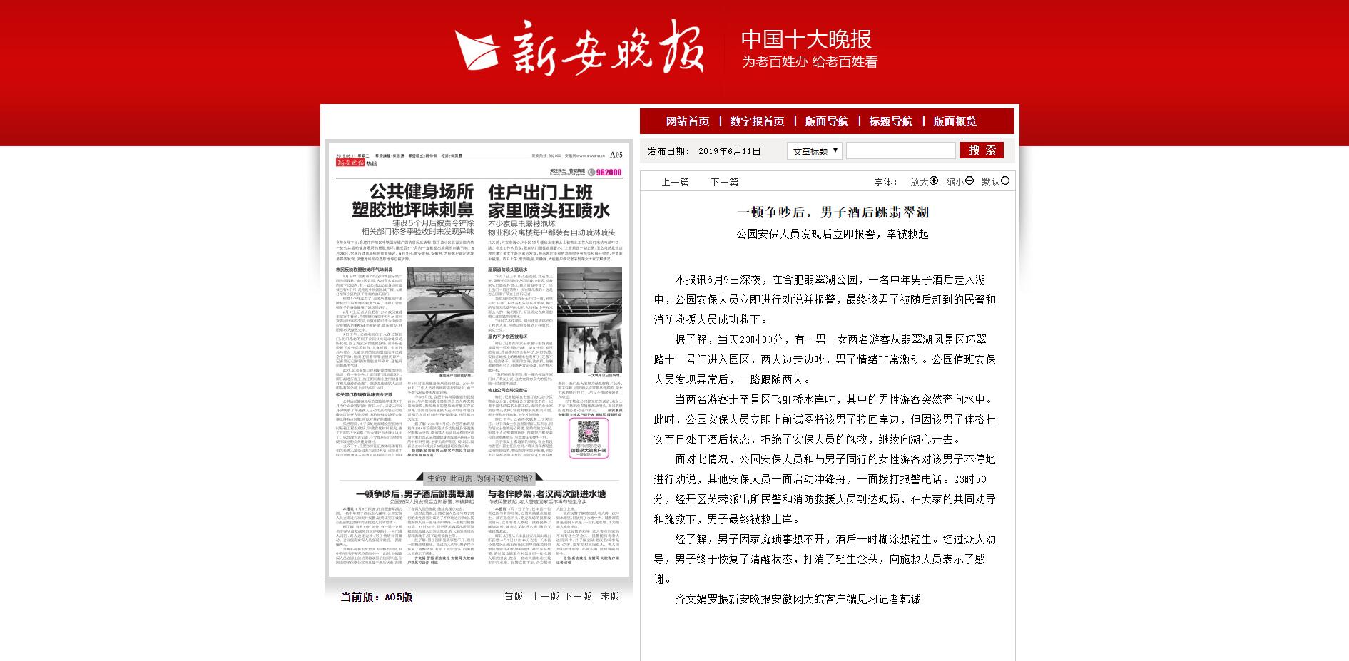 新安晚报6月11日第五版:一顿争吵后,男子酒后跳翡翠湖 公园安保人员发现后立即报警,幸被救起http://epaper.ahwang.cn/xawb/20190611/html/page_04_content_002.htm
