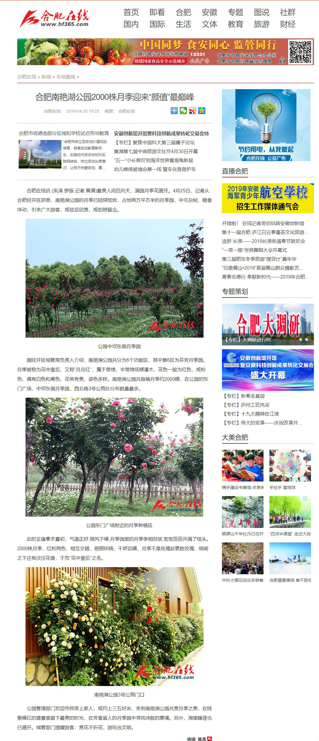 安徽网:合肥南艳湖公园2000株月季迎来“颜值”最巅峰:http://www.ahwang.cn/hefei/20190425/1870014.shtml
