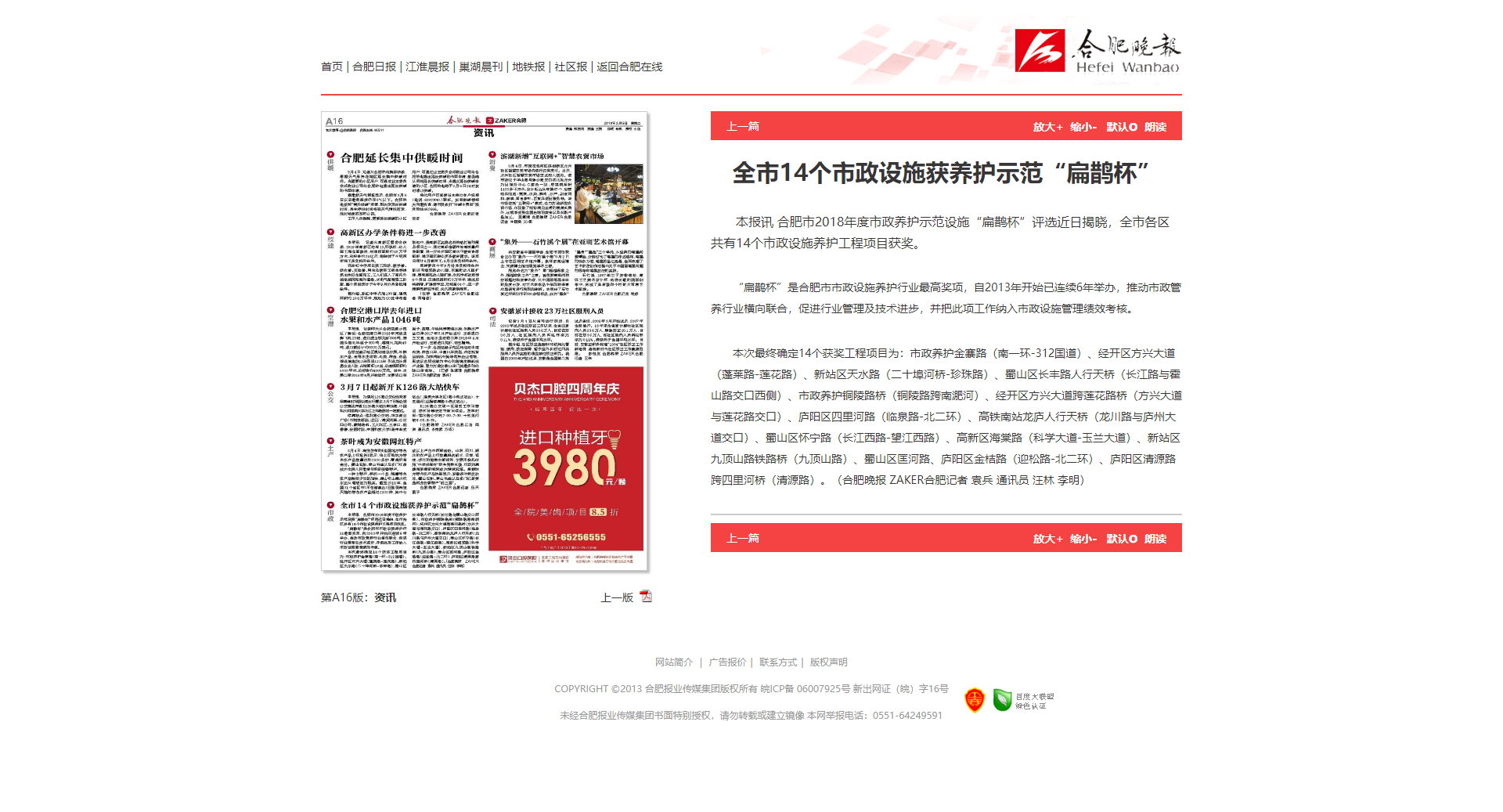 下一条:合肥晚报、安徽网新闻中心:合肥市14条道路获“扁鹊杯”