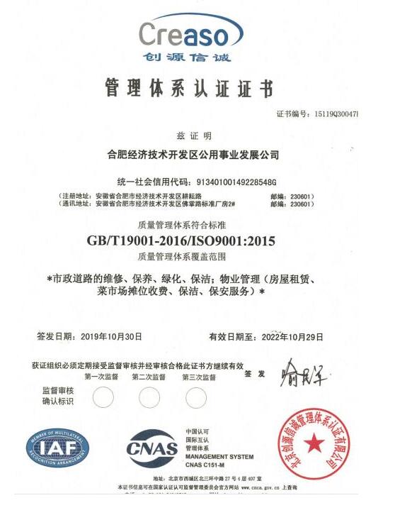 经过公司上下为期半年多的努力,2019年11月8日,公用公司获得北京创源信诚管理体系认证有限公司颁发的ISO9001质量管理体系证书,标志着公司在管理的科学化、制度化、标准化、规范化方面迈上新台阶。