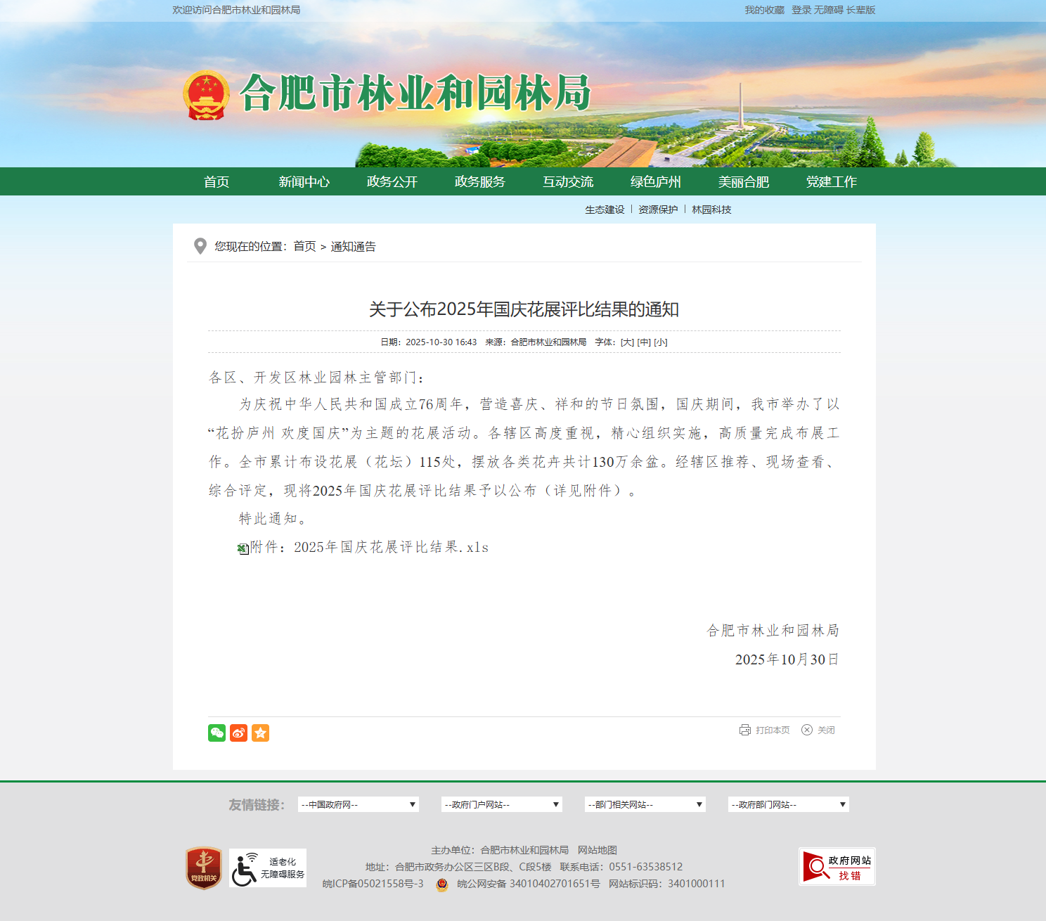 近日,合肥市2025年“花扮庐州 欢度国庆”花展评比结果正式公布,由香怡园林公司承办并参选的经开区三处花展作品在评选中脱颖而出,分别斩获一等奖、二等奖及三等奖。