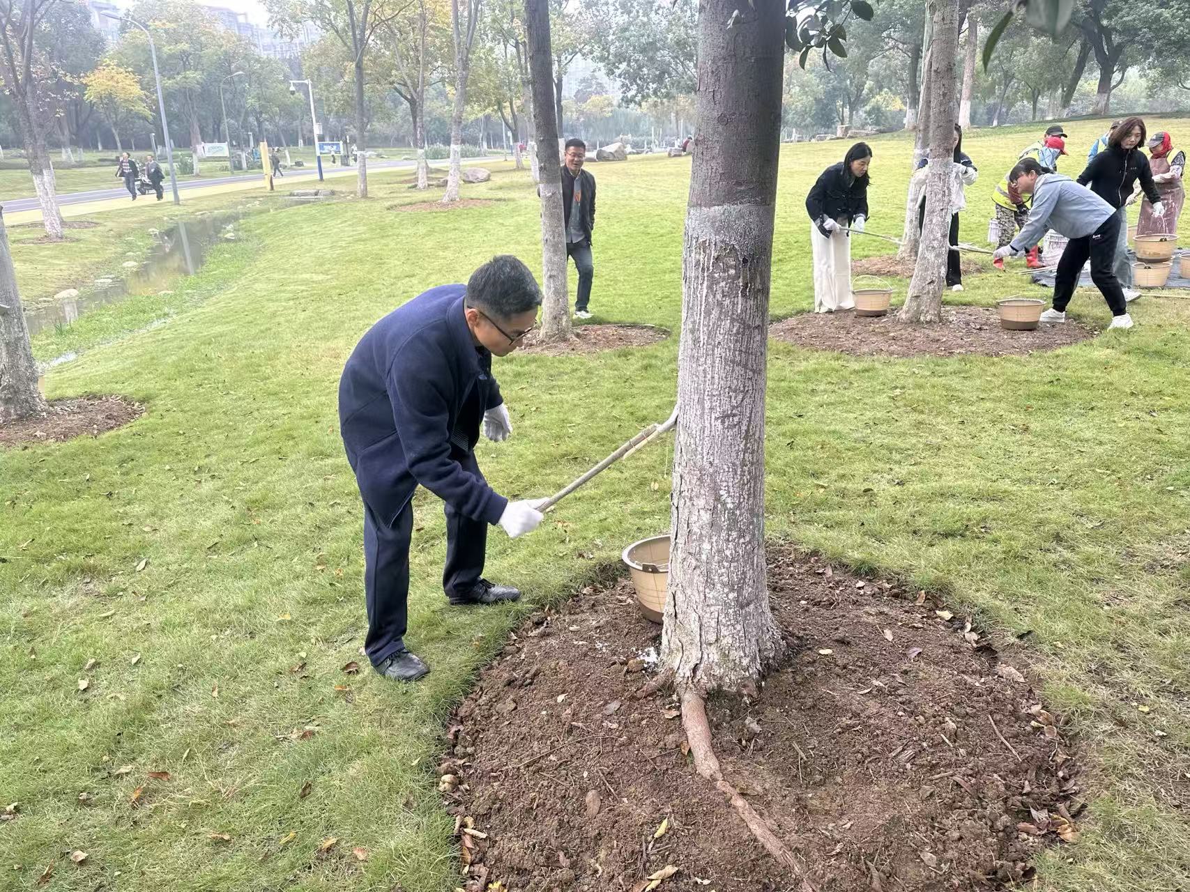 随着冬季临近,为树木刷白既可有效防治病虫害、降低冻害风险,也有助于美化公园环境,提升整体景观效果。活动中,支部党员与园区工作人员通力协作,重点围绕阳光大草坪区域乔木进行刷白作业。大家分工有序、配合默契,有一组严格按照配比科学调制涂白剂,确保石灰与水的比例精准,保障防护效果;另一组手持刷具,细致地将涂白剂均匀涂抹于树干,做到高度一致、平整美观。尽管石灰水不时溅到身上,但大家始终热情高涨、干劲不减,高标准完成了任务。