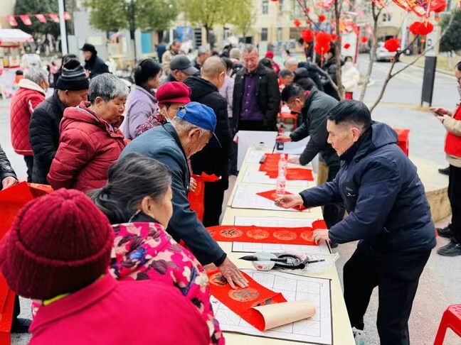 送福联专区暖意融融,书法家志愿者挥毫泼墨,书写新年祥瑞的春联、福字,饱含对居民的新春祝福。社区和物业还为“窗帘之约”独居老人开辟上门通道,志愿者带着春联、灯笼和伴手礼登门拜访,让独居老人的屋子暖意涌动、年味十足。
